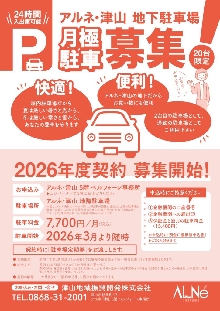 2026年度契約募集開始!(20台限定) 【駐車場所】アルネ・津山地下駐車場 【駐車料金】7,700円/月額(税込) 【駐車開始】2026年3月1日(日)より随時 【お申込】アルネ […]