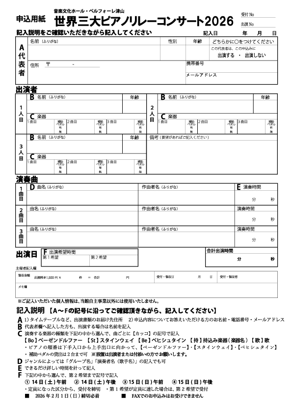 ※出演中の出演者(伴奏者も含む)の交代・追加がある場合、別々のお申込みとして受付ます。