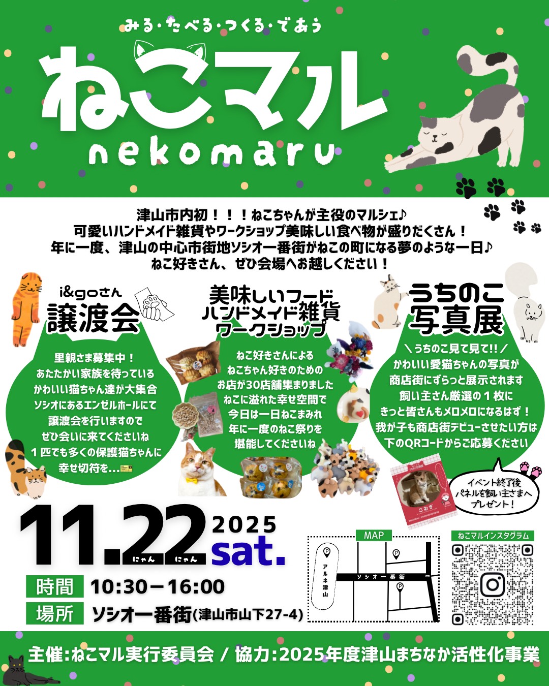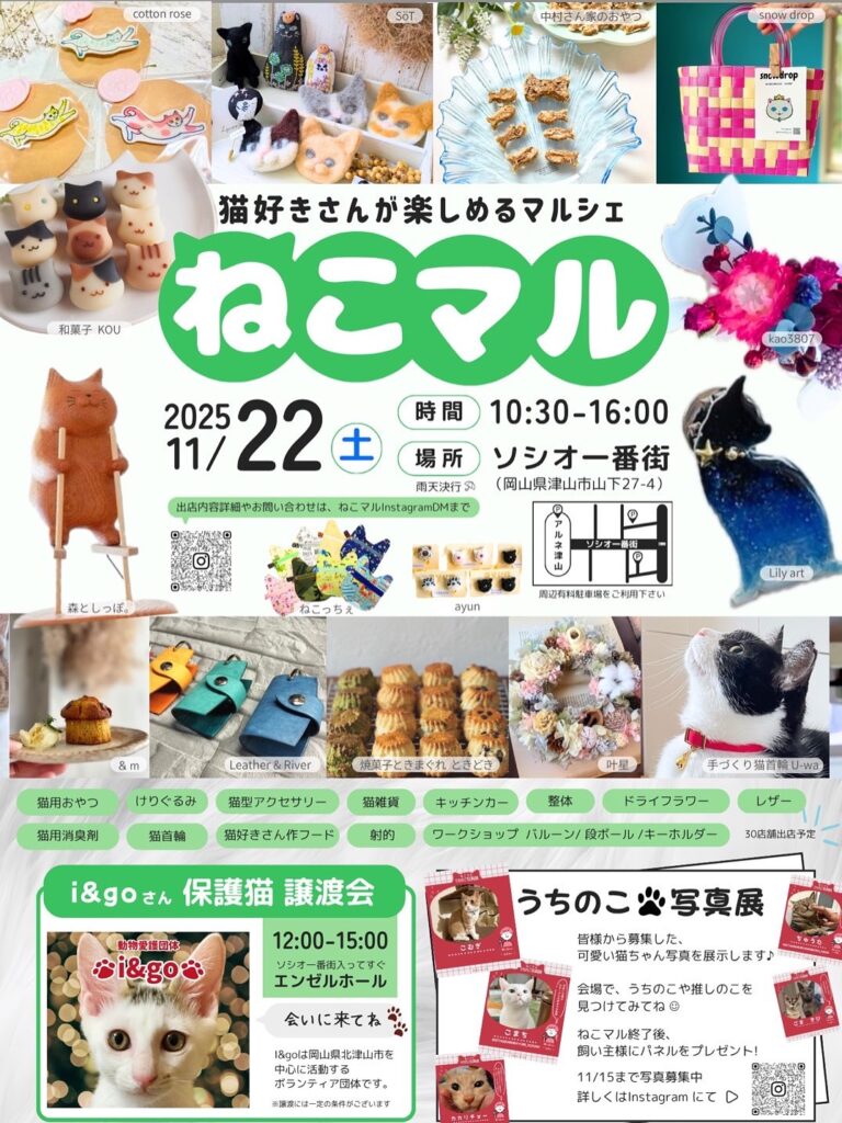 ねこマル nekomaru 日時 202511月22日(土) 時間 10:30~16:00 会場 ソシオ一番街(津山市山下27-4) 問合せ NPO法人CHIGAYA contact@chigaya.org 津山市内初!!!ねこちゃんが主役のマルシェ♪ 可愛いハンドメイド雑貨やワークショップ美味しい食べ物が盛りだくさん! 年に一度、津山の中心市街地ソシオ一番街がねこの町になる夢のような一日♪ ねこ好きさん、ぜひ会場へお越しください!